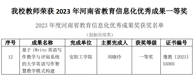 近日,河南省教育厅公布了2023年度河南省教育信息化优秀成果奖获奖名单,公司FUN88乐天使教师刘晓玲获得教育信息化“创新应用类”优秀成果一等奖。